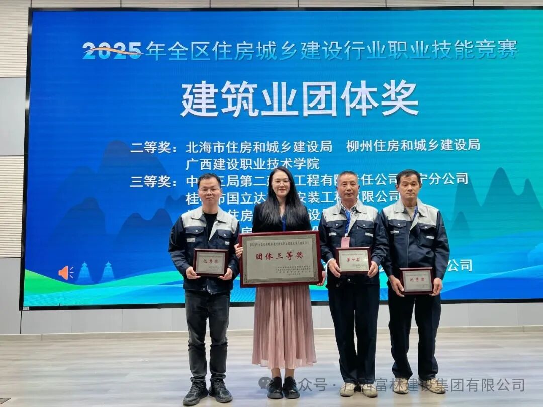 近日,2025年全区住房城乡建设行业职业技能竞赛在广西城市建设学校(会仙校区)圆满落幕。广西富林建设集团有限公司选派的三名参赛选手凭借扎实的专业技能与出色的现场表现,在竞赛中脱颖而出,不仅斩获个人奖项,集团更荣获团体三等奖,充分彰显了企业在住房城乡建设领域的人才实力与技术底蕴。